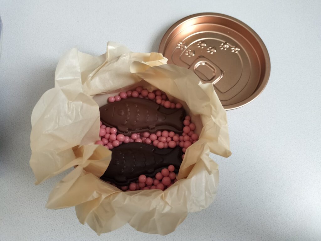 中身は、魚型のチョコとイチゴ味のパフチョコが入ってて、可愛すぎる…
